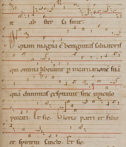 These dots and dashes indicate the pitch of the notes but not the length or duration, which probably depended on the flow of the text and local practices of the nunnery or monastery in which they were taught and sung.