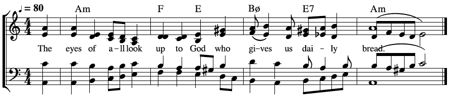 Most of the sung responses reflect the main theme of Psalm 145, which is praise for the gracious kingdom of God. Our purposes lead us towards the theme of divine provision and the verses quoted above. We shall use a little home-grown tune — the second in two weeks — for both verses and response: