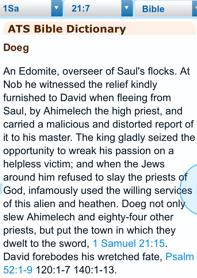 Doeg is not, one has to admit, a big name in biblical tales. A devious fellow, it seems, which is what got David so worked up. Best I quote one of the dictionaries (see box, click to enlarge):