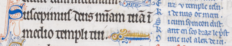 The illustration, from the Oscott Psalter of around 1270 CE, shows the Latin script of that same verse: Suscepimus Deus misericordiam tuam in medio templi tui. Note the abbreviation, common in medieval manuscripts, marked by superscript tilde ~. Thus the third word misericordiam (mercy or loving-kindness) appears as mīam, and in as ī. The script in blue in the second column is described as a ‘metrical paraphrase’. This beautiful psalter includes no antiphon.