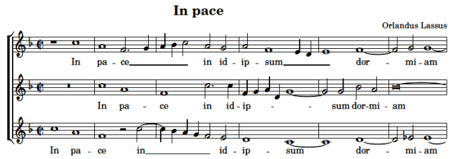 It was this last verse that attracted many composers, Sir Arthur Sullivan amongst them, as a safe bet for a nice song. Lassus lined up for two different settings, one for the whole psalm entitled Cum invocarem (‘When I call’, v.1) for six voices, and the other In pace a simpler and shorter setting of those last lines for three equal voices. This last one might interest small groups.