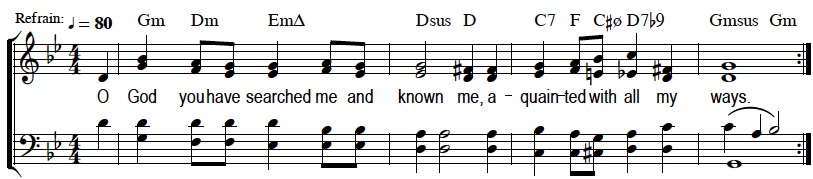 This retains the idea of acquaintance, rather than intimate knowledge, a mild reminder that we are not alone. The refrain and verse tune was originally composed some years ago with a sound character that might fit in with a Taizé service. (It was not used and has not yet enjoyed its world premiere.) Here it is in the G minor version: