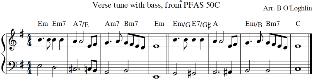 The beauty of this song, in which we can sense the creative hand of John Bell, is enhanced by the supporting harmonies, here sketched in outline by the two parts. On the surface, it’s a plain vanilla I-IV-V routine, majors, minors or sevenths to taste. The tune repeats precisely, but the bass line leads the second part into delightfully fresh territory by taking a quite different path. The contrast is enhanced by having the bass play the tenor part in the first two bars, which in the original Iona Community composition are anchored on an E pedal. The bass therefore follows gentle but determined descending then ascending lines. The bare notes sound like this: