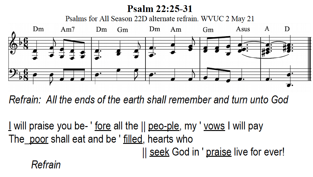 However, sensing that our group rather leans towards a more lively or interesting vocal treatment than the sedate chanting of the text with pointing to a plain tone, here is part of a paraphrase scanned to meet the rhythm of the refrain. The music has been arranged for three part voice, rather than unison in PFAS.