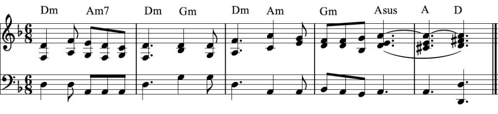 As usual, the authors offer a simple two-bar chanting tone, unexceptional save for a nice chord sequence of Dm-Cm7-BbΔ7-C.