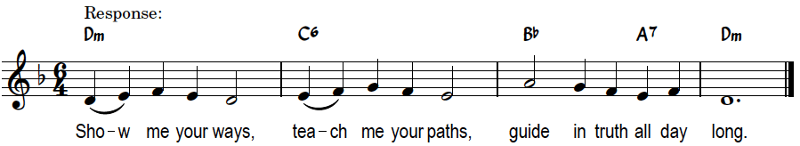 28 Nov, Ps 25:1-10. And so again into Advent and Year C of the Lectionary. Slight change of plan as we go back to gathering in Curtin as social restrictions ease. The replacement refrain is supported by a common chord sequence as shown below. The words of the verses are sung to a different tune on the same chords: