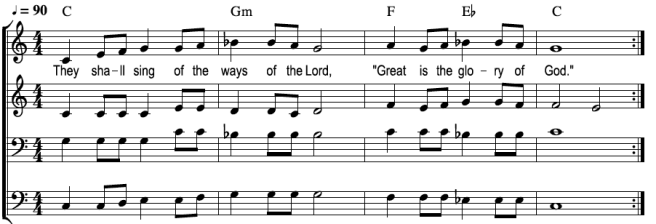 Some years ago I arranged this refrain for four voices, then paraphrased the verses to fit the same tune with an additional contrasting B section in an AABA. The four part harmony is definitely not happening, but for interest, here’s the refrain: