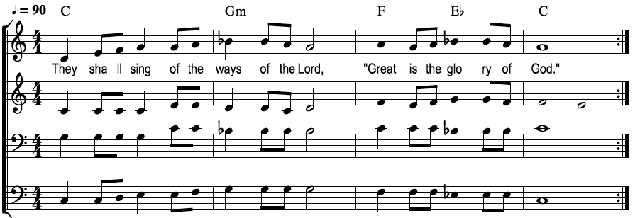 Some years ago I arranged this refrain for four voices, then paraphrased the verses to fit the same tune with an additional contrasting B section in an AABA. The four part harmony is definitely not happening, but for interest, here’s the refrain: