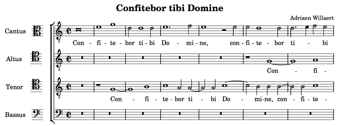 Delightful early music settings are to be found under various headings, corresponding to various verse selections of the psalm and the various languages of the composers. Some examples are In conspectu angelorum (Francisco Guerrero), Confitebor tibi Domine (Lassus, Mendelssohn, Willaert) and Il faut que tous mes esprits (Paschal de L’Estocart, Jan Sweelinck).