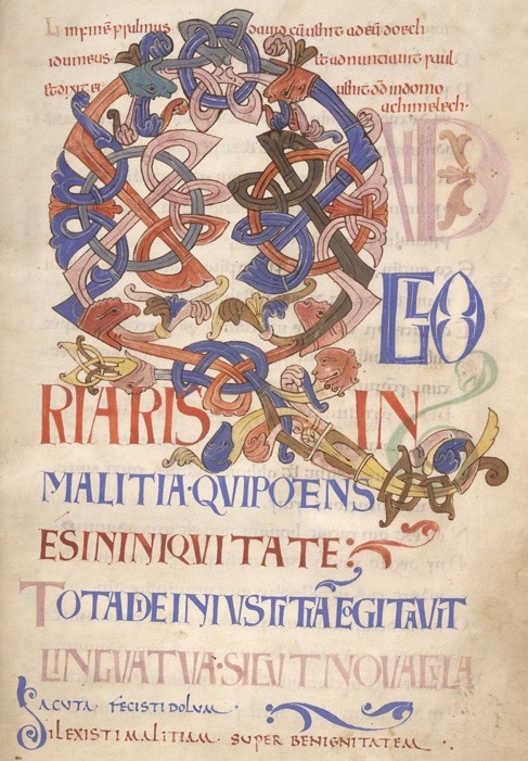 The Psalter’s large initials together with multi-coloured script divide the text in three parts at Psalms 1, 51 and 101, in a division of the so-called ‘three fifties’ that is found in English, but not most Continental manuscripts. The scribe used initials with interlace decoration, some zoomorphic elements and capital letters of varying size and colour to enhance the importance of these pages.