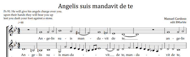 Johann Michael Haydn (1737-1806) wrote a nice setting entitled Angelis suis Deus mandavit for this psalm. Mendelssohn’s Denn Er hat seinen Engeln befohlen über dir is also about the angels of verses 11-12. This performance by Voces 8 singing from memory in a lovely setting — and conveying a deceptive casual air enabled no doubt by significant talent, experience and concentration — is delightful: