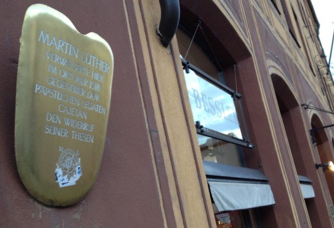 A building in Augsburg bears a plaque recording the fact that therein, Luther defended himself before the Papal investigation of 1518. His pleas fell on deaf ears, as we know (well, he was a bit rough on the Pope) and he went into hiding.