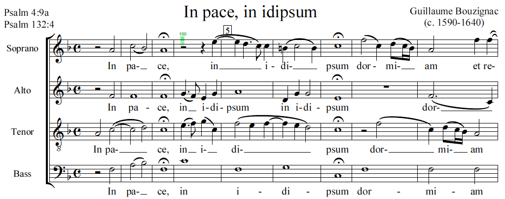 Here is a beautiful recently released recording of a stately setting In pace in idipsum by French composer Guillaume Bouzignac (c. 1590-1640), respected but less famous precursor to Charpentier. As shown above, his motet draws on both Psalms 4 and 132: