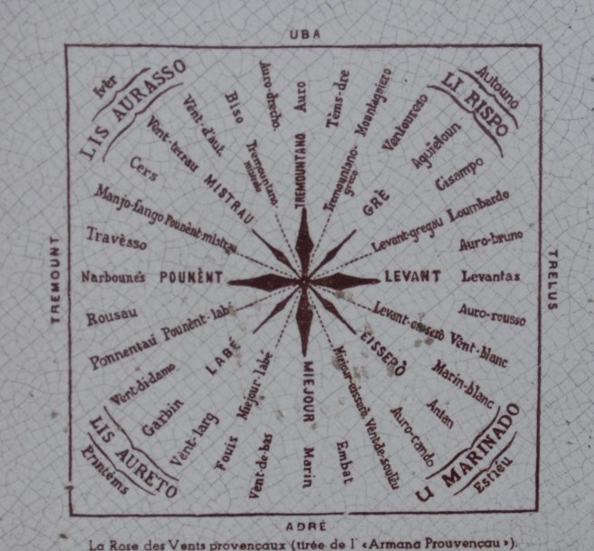 La rose des Vents Provençeaux; traditional names of the winds from all points of the compass in Provence; from a plaque in Orange, France.